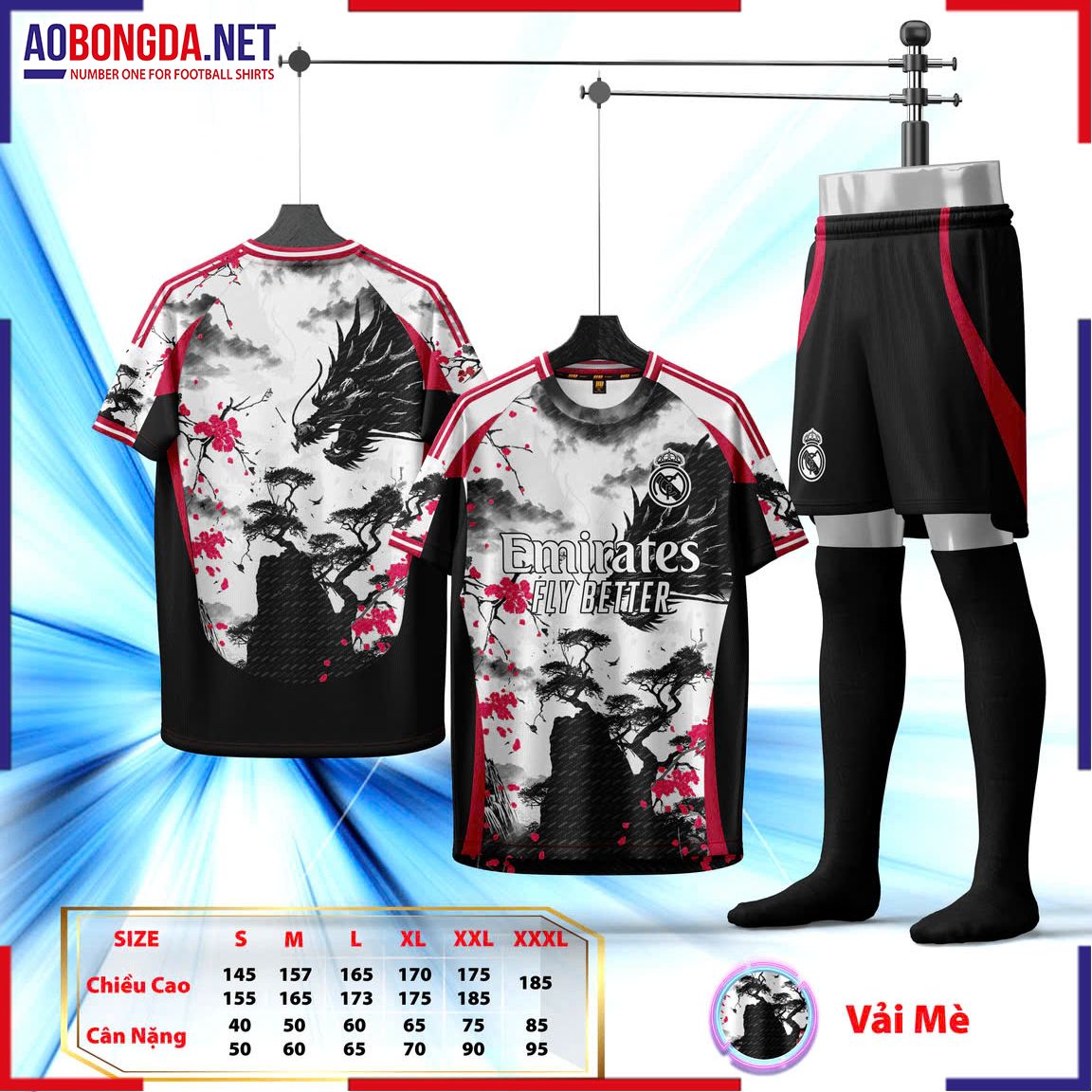 Họa tiết Rồng Đen in sắc nét, tượng trưng cho quyền lực và sức mạnh của Real Madrid.