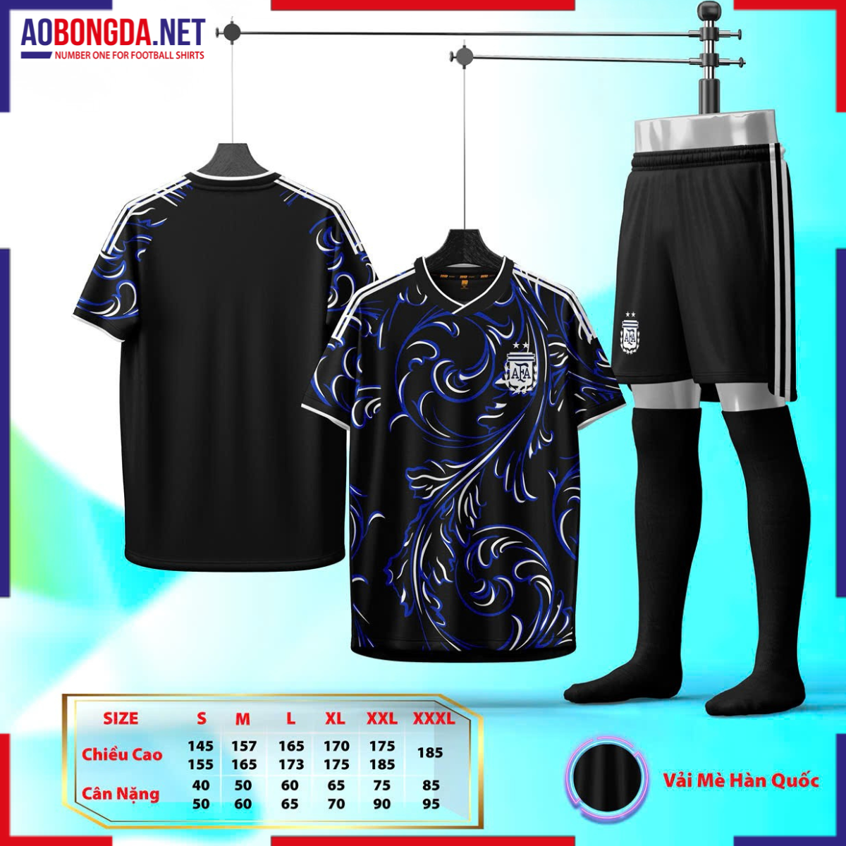Phong cách retro độc đáo: Dải xanh lam vai áo mang cảm hứng từ quốc kỳ Argentina, nổi bật trên nền đen cá tính. Logo AFA 3 sao được ép nhiệt cao cấp, sắc nét và bền màu.