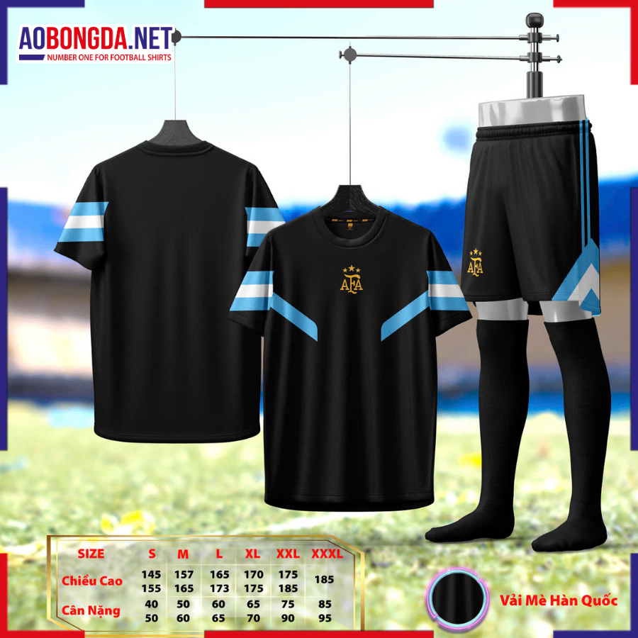 Phong cách retro độc đáo: Dải xanh lam vai áo mang cảm hứng từ quốc kỳ Argentina, nổi bật trên nền đen cá tính. Logo AFA 3 sao được ép nhiệt cao cấp, sắc nét và bền màu.