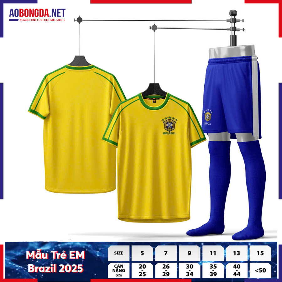 ✅ Thiết kế độc đáo: Lấy cảm hứng từ các mẫu áo kinh điển của Brazil, đường viền màu xanh phối phá cách giúp bé nổi bật trên sân bóng.
