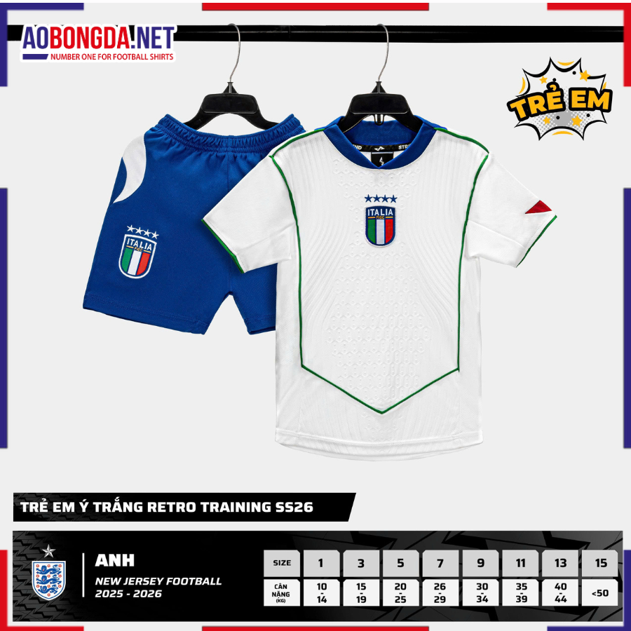 Áo Bóng Đá Đội Tuyển Ý Trẻ Em Trắng 2025-2026 là lựa chọn lý tưởng cho các fan nhí của Azzurri – đội bóng từng 4 lần vô địch World Cup. Thiết kế mới lấy cảm hứng từ di sản bóng đá nước Ý kết hợp phong cách retro thời thượng, mang lại diện mạo mạnh mẽ và đậm chất cổ điển.