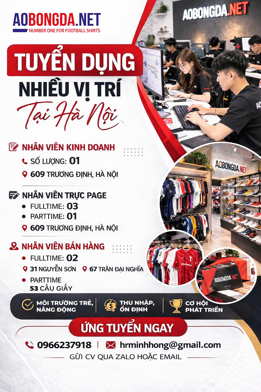 Hệ thống cửa hàng AOBONGDA.NET – Number One For Football Shirts đang mở rộng hoạt động và tuyển dụng nhiều vị trí làm việc tại Hà Nội. Đây là cơ hội dành cho những bạn trẻ yêu thích bóng đá, thời trang thể thao và môi trường làm việc năng động.